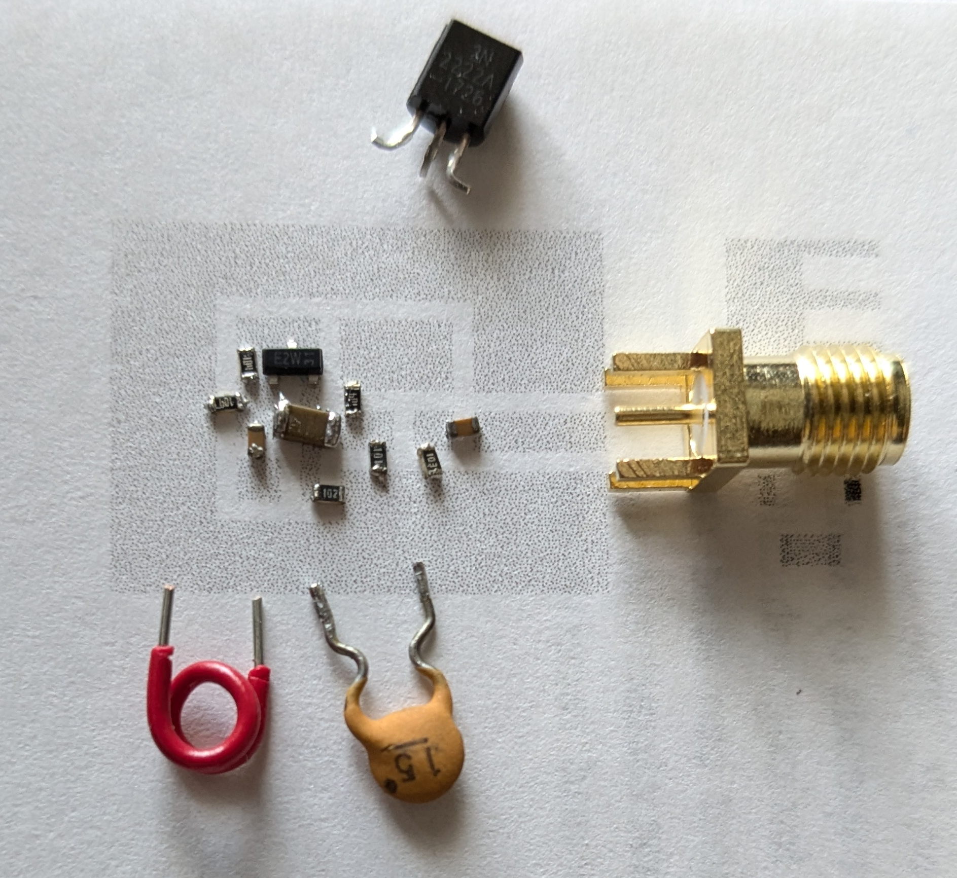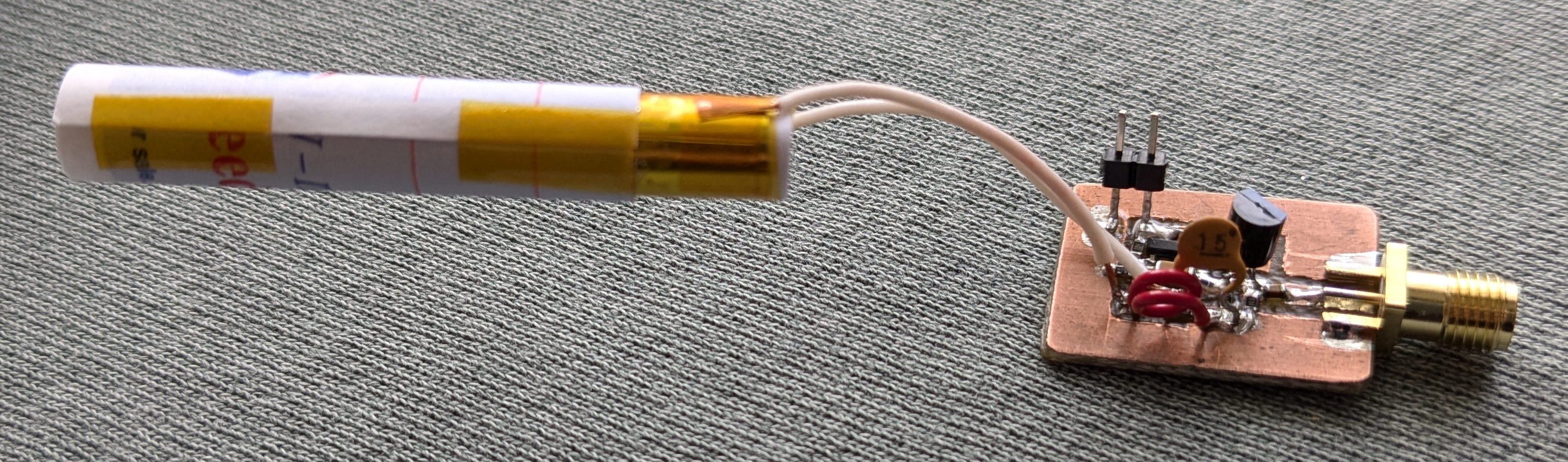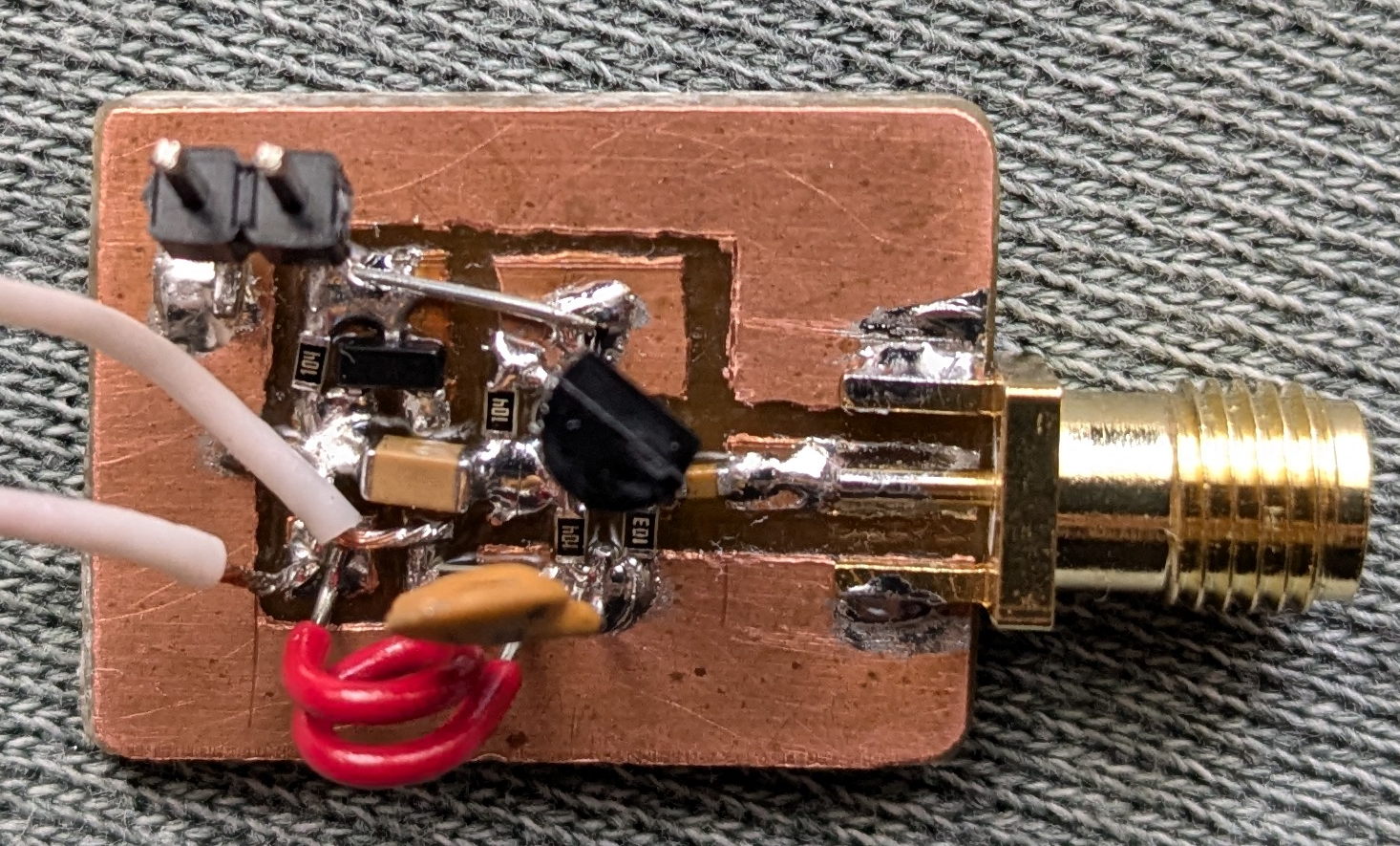 Once assembled, I power it at 5V through a 1kOhm resistor and make sure the current draw is less than the 5mA the resistor would allow (it drew about 1mA which is in line with the simulation). I checked for any shorts and made sure the bias voltages looked fine. The moment of truth came, I start up my spectrum analyzer (an RTLSDR and spektrum) and... Nothing.
