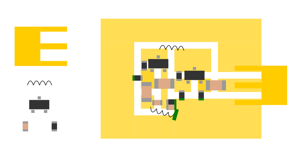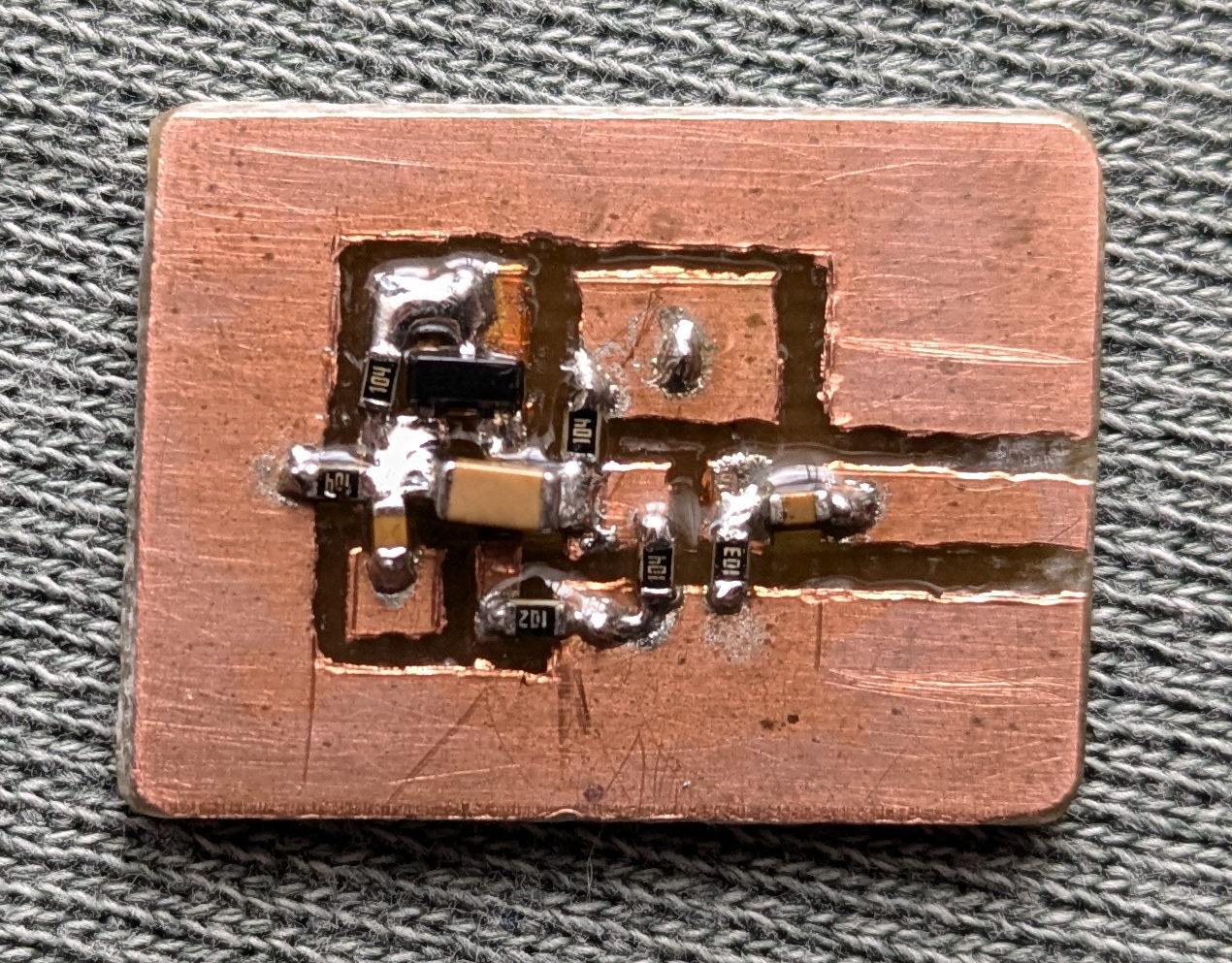 For the layout I started off by drawing up correctly sized prefabs for each of the SMD components I would be using. I then arranged the components in the shape of the circuit and started drawing islands for each node. After a bit of tweaking to make sure the gaps around islands were consistent, I printed it out and checked the scaling to make sure everything would correctly fit. Once I was confident with the layout I moved onto the actual build.